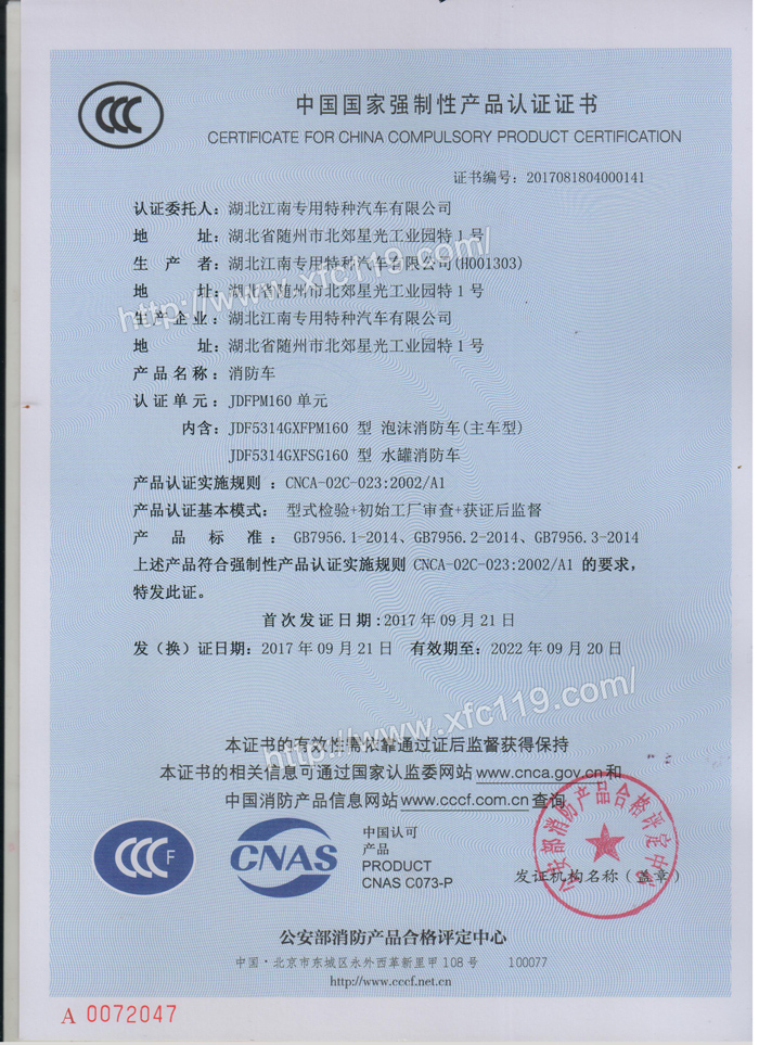 熱烈慶賀我公司湖北江南專用特種汽車有限公司國五消防車3C已率先批下,領(lǐng)跑全國,是消防車廠家里面國五消防車車型第一批下發(fā)3C的企業(yè),這也證明了我公司的國五消防車車型質(zhì)量,技術(shù)方面全面得到國家認可和好評。歡迎新老客戶來我廠考察選購消防車車型及邀約我公司參加各公司各政府單位消防車項目招標活動。