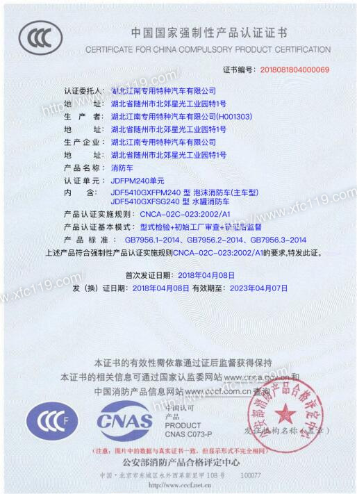 我公司湖北江南專用特種汽車有限公司申報的國五豪沃前四后八24噸消防車3C目前已經下發