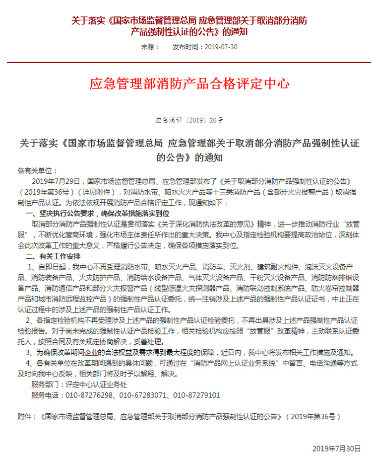下面為廣大用戶(hù)解讀下這次重要通知的意思,該文件內(nèi)容主要針對(duì)消防產(chǎn)品,消防車(chē)包含在內(nèi),是關(guān)于取消消防車(chē)3C認(rèn)證的通知,根據(jù)國(guó)家應(yīng)急管理部消防產(chǎn)品合格評(píng)定中心于2019.7.30發(fā)布的(應(yīng)急消評(píng)2019/20號(hào))關(guān)于取消部分消防產(chǎn)品強(qiáng)制性認(rèn)證公告。所有國(guó)五消防車(chē)強(qiáng)制性認(rèn)證證書(shū)從2019年8月1日全部為注銷(xiāo)狀態(tài),我公司新的國(guó)五消防車(chē)和國(guó)六消防車(chē)自愿認(rèn)證正在轉(zhuǎn)換中。因此根據(jù)文件要求,以前的原證書(shū)不得再流出使用。