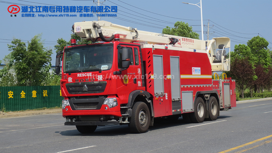 江特牌JDF5330JXFJP32型舉高噴射消防車選用中國重汽T系列豪沃消防車底盤,原廠單排雙開門駕駛室,可載含駕駛員在內(nèi)的乘員2人,駕乘舒適輕便;集水罐車、泡沫車、高噴車三者功能與一身,具有高層滅火、火場監(jiān)控、快速作戰(zhàn)等國內(nèi)先進水平高性能多功能消防車。該車采用電液比例及下車集中控制技術(shù),是全液壓驅(qū)動、伸縮加折疊臂式消防車;同時該車自帶7噸水罐及2噸泡沫罐,可在距離水源較遠的位置完成消防作業(yè)。該車綜合應(yīng)用新技術(shù)、新工藝、新材料并結(jié)合自身技術(shù)優(yōu)勢,豐富高噴車的功能配置,提高高噴車的單車作戰(zhàn)能力。該車可廣泛應(yīng)用于城鎮(zhèn)、工礦企業(yè)等中高層建筑及石油化工企業(yè)、油罐、倉庫等高大建筑的火災撲救,也可作為水罐泡沫車單獨使用。
